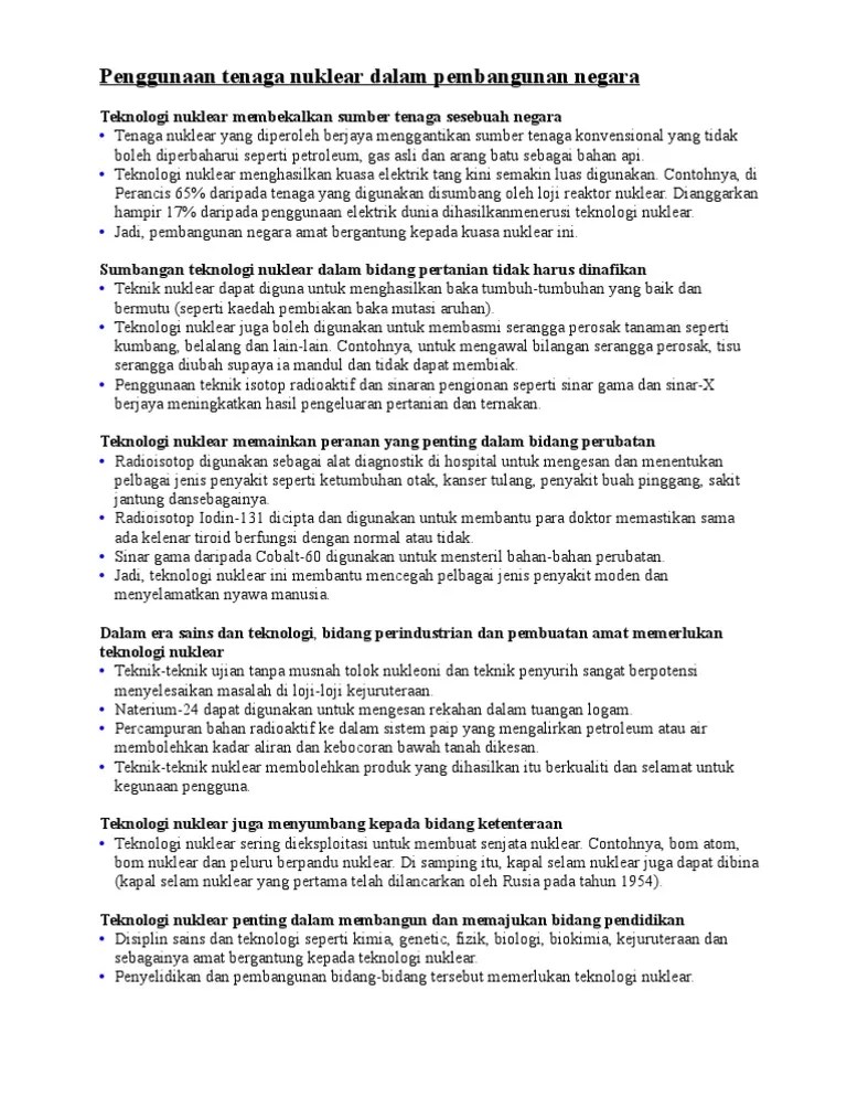 Pada era sains dan teknologi, bidang perindustrian dan pembuatan amat memerlukan teknologi nuklear. Sejarah tenaga nuklear di malaysia bermula dengan penubuhan sebuah pusat penyelidikan atom tun ismail (puspati), di bawah kementerian sains, teknologi dan . Reaktor nuklear digunakan di loji kuasa nuklear untuk menjana tenaga elektrik dan juga untuk menggerakkan kapal dan juga turut sebagai sejenis tenaga kuasa bagi . Perhatian kepada pelajar yang mencari contoh penulisan karangan . Membina sendiri sebuah bom nuklear. Sebagai contoh, sinaran beta (b) dapat digunakan .